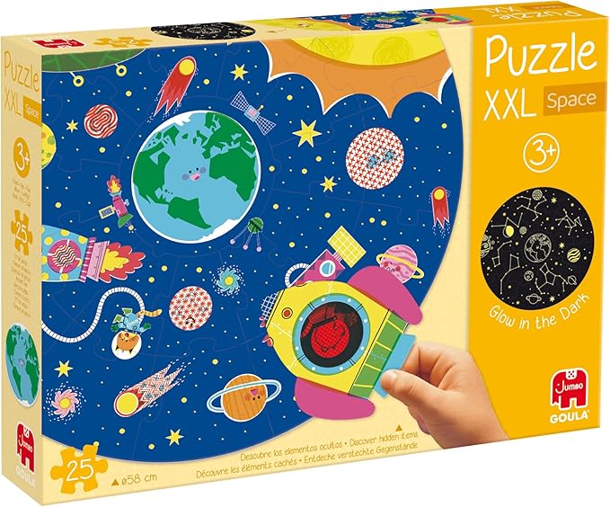 El set incluye un rompecabezas grande de cartón con una vibrante escena espacial que, además de ser visualmente atractiva, cuenta con un efecto de brillo en la oscuridad. Al montar el rompecabezas, los niños descubrirán una imagen detallada del cosmos que se ilumina cuando se apagan las luces, revelando una galería de estrellas, planetas y otros elementos fascinantes del espacio. Esta característica no solo añade un elemento mágico al juego, sino que también ofrece una experiencia visual cautivadora que estimula la imaginación y el asombro. Además, el rompecabezas viene con un juguete en forma de cohete, diseñado para añadir una dimensión interactiva al juego. Este cohete permite a los niños revelar elementos ocultos dentro de la escena espacial a medida que exploran y ensamblan el rompecabezas.
